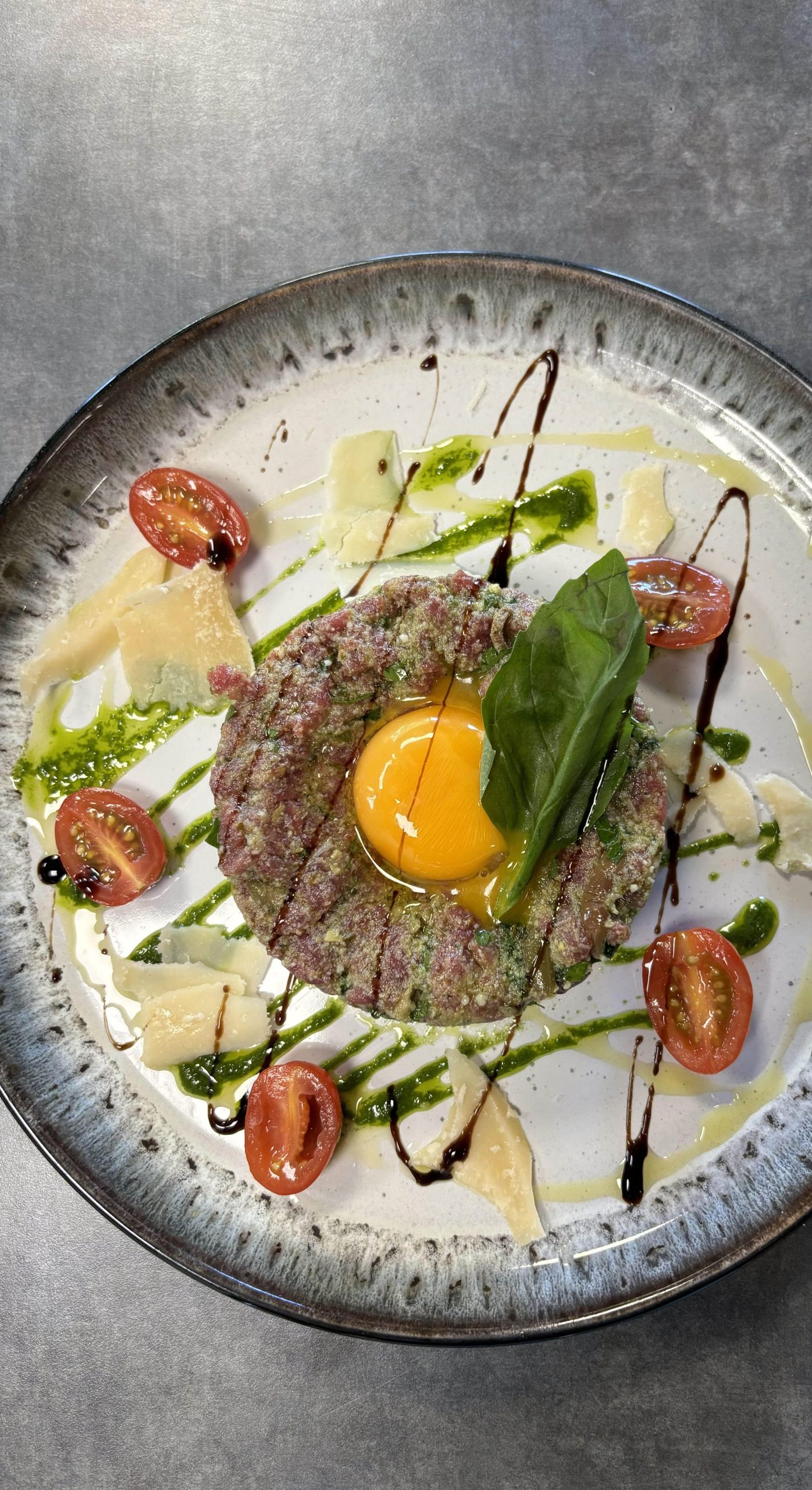 Bœuf coupé au couteau, pesto basilic, tomates séchées, câpres, pignons de pin, copeaux de parmesan, jaune d’œuf. Servi avec frites maison