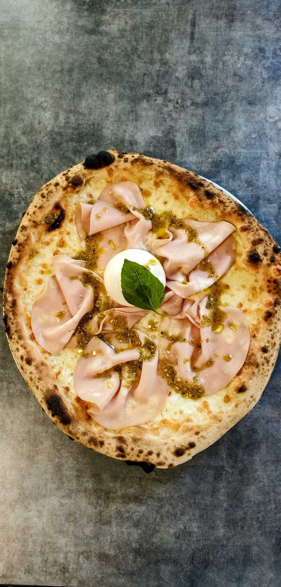 Fior di latte, pomme de terre, jambon cru, crème de parmesan, champignons